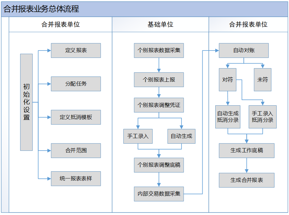 上圖描述的是一次合并的完整應用流程,是采用大合并的方式進(jìn)行合并的操作步驟示意。如果整個(gè)集團采用逐級合并的方式進(jìn)行合并,則每級合并主體都要經(jīng)歷上述合并過(guò)程,且上級的合并要在下級的合并完成后進(jìn)行。用逐級合并的方式完成一次集團合并,相當于多個(gè)合并流程的疊加。